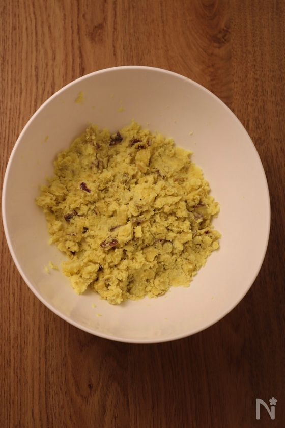 (2) フォークやマッシャーでなめらかになるまでつぶす。