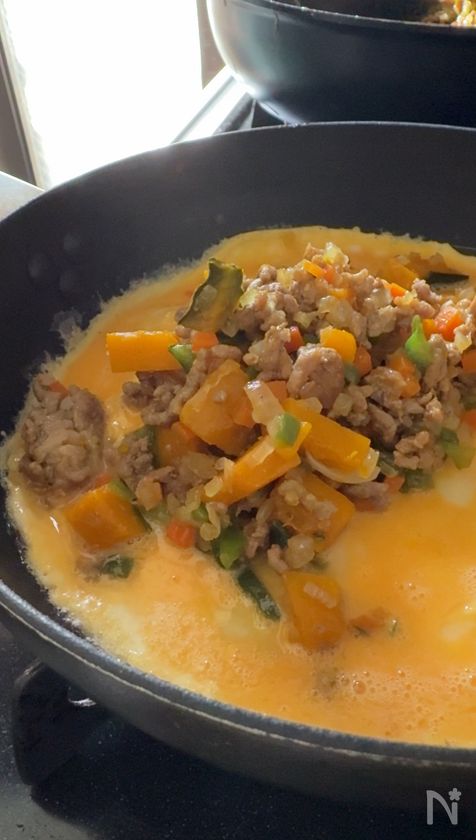 卵を流し軽く混ぜる。火が通りはじめたら具材を入れ包む。