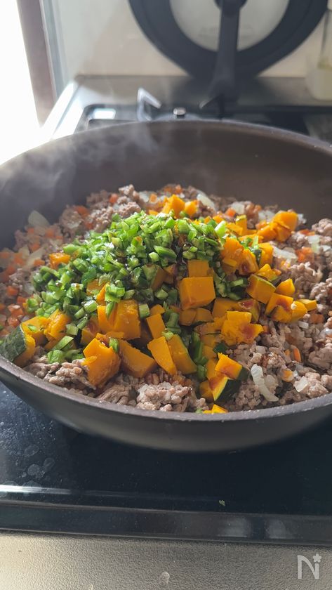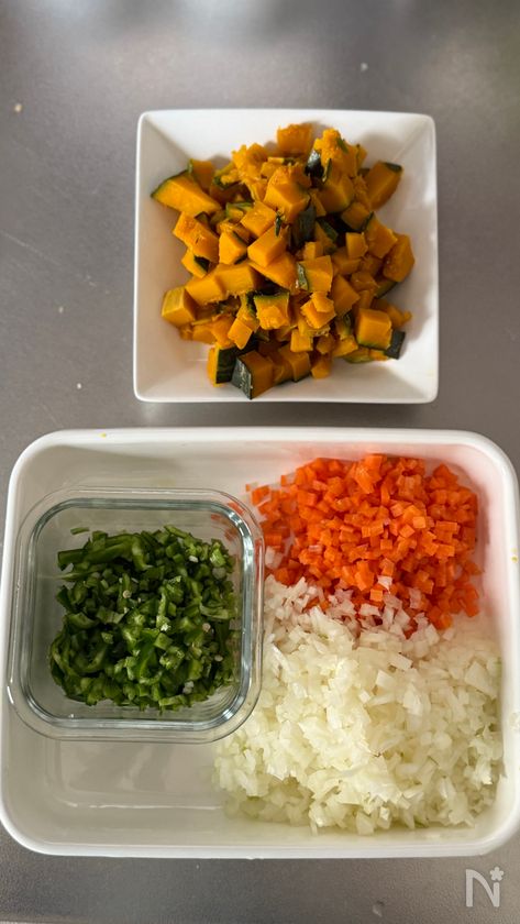 (1) かぼちゃは種ワタを取ってラップで包み、600w4分半加熱し1〜1.5cm角に切る。玉ねぎ、人参、ピーマンはみじん切りにする。