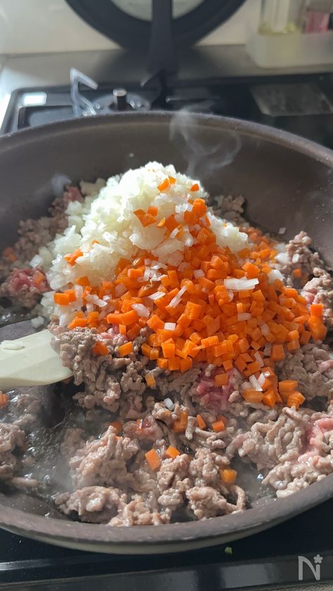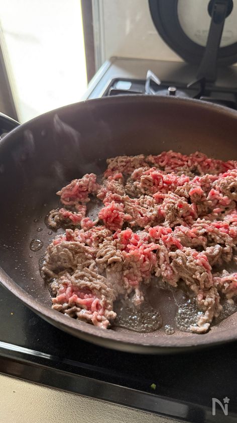 (2) フライパンに薄く油を引き合挽肉を中火で炒め、火が通り始めたら【A】で下味を味つける。