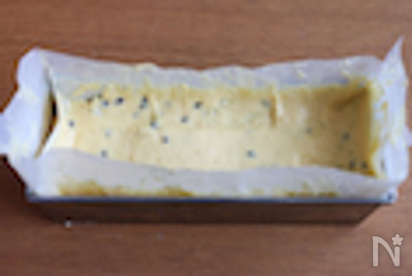 (1) 無塩バターは柔らかくしておく。型に紙を敷き、オーブンは180℃に予熱、薄力粉はベーキングパウダーと合わせてふるっておく。卵は常温にもどし溶いておく。