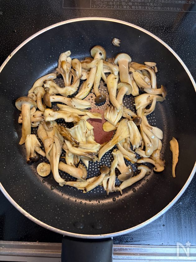 (2) フライパンにオリーブオイルを熱し、しめじと舞茸を炒める。塩少々をふり、香ばしくソテーする。