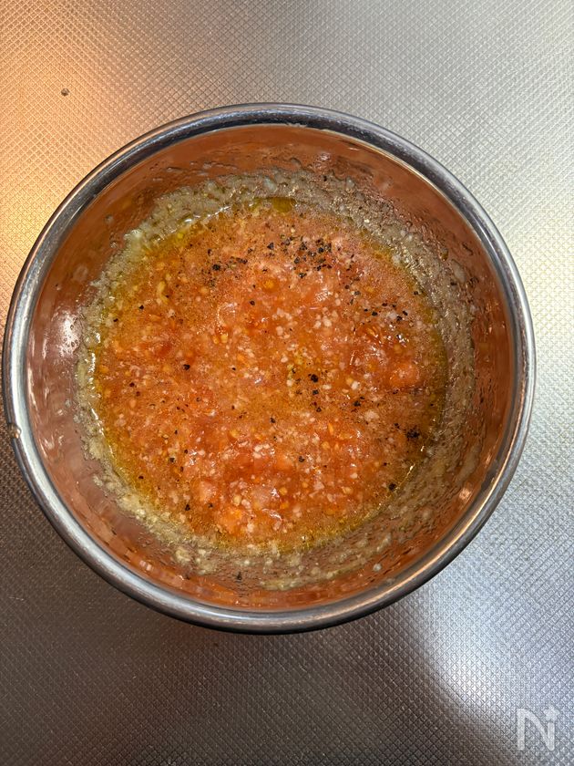 ・トマトはヘタを取り、すりおろす(または細かいみじん切り)。