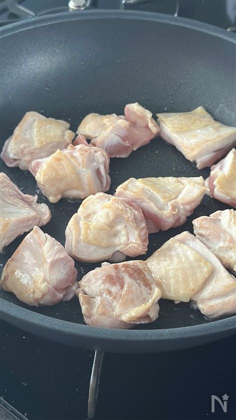 (1) 鶏もも肉は一口大に切り、フライパンに油小さじ1(分量外)を入れて中火で焼く。