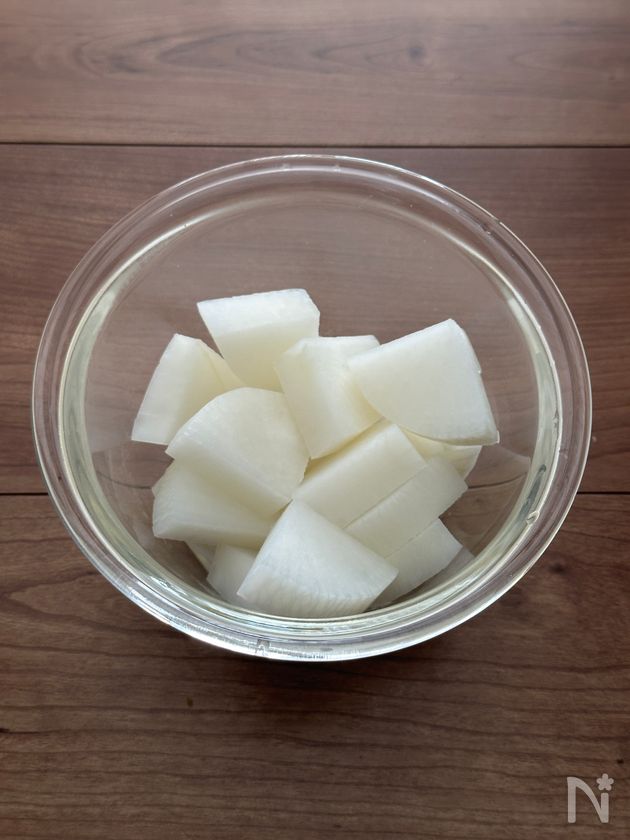(2) 大根は1.5cm幅のいちょう切りにし、耐熱ボウルに入れてふんわりラップをして600wの電子レンジで4分30秒加熱する。