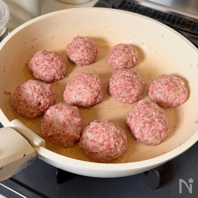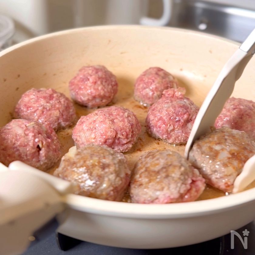 (2) フライパンに合い挽き肉・玉ねぎ・【A】を入れて混ぜ合わせる。