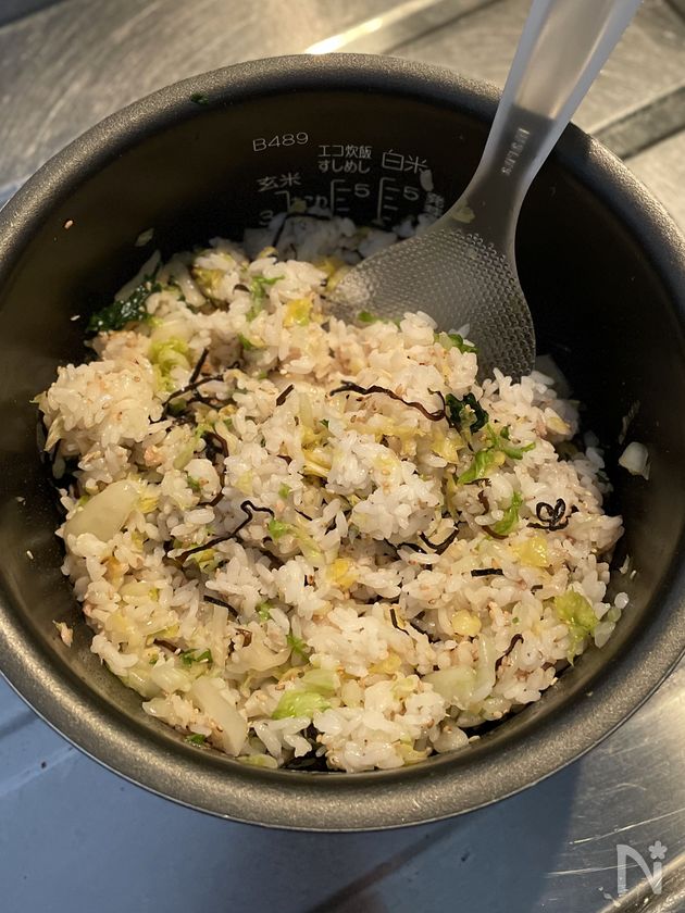 炊いたご飯に混ぜるだけ♪子供爆食「白菜とツナの炊き込みご飯」