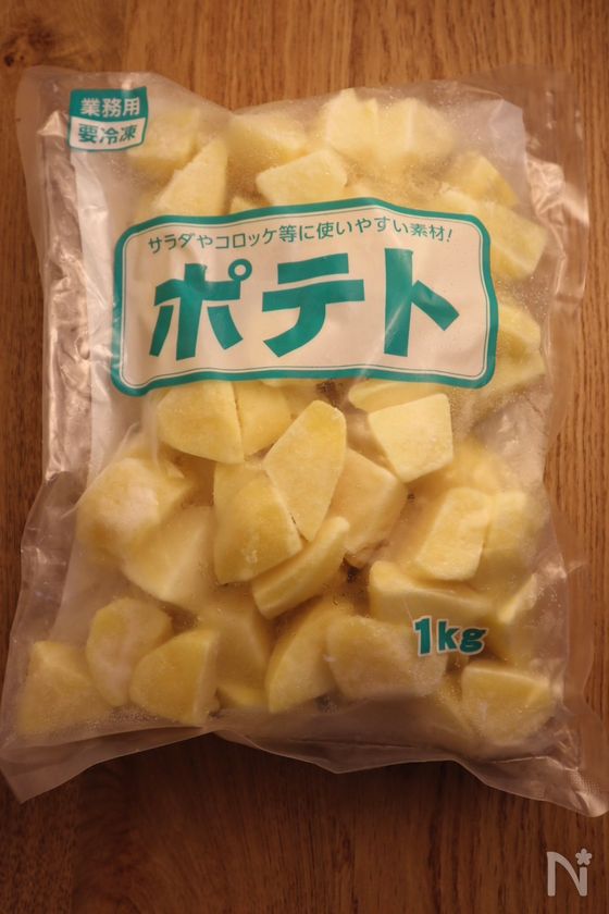 (8) 業務スーパーのポテトを使用しました。使いたい分だけ取り出せるバラ冷凍タイプ。下処理いらずでそのまま調理できるのが嬉しいポイント。ホクホク食感で、冷凍とは思えない仕上がりです。
