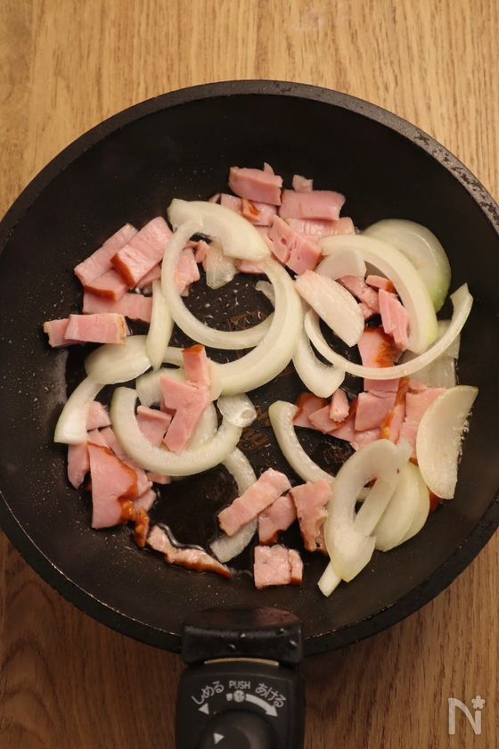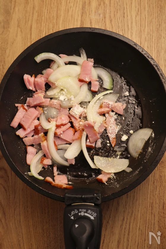 (2) フライパンにオリーブオイルをひき、中火でベーコンと玉ねぎを1〜2分炒める。