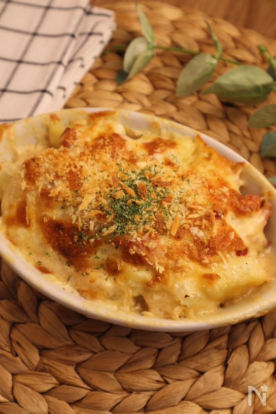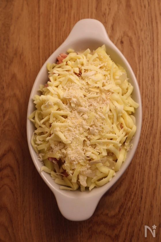 (5) グラタン皿にポテト→④→ピザ用チーズ→パン粉の順に重ね、200度で予熱したオーブンで10〜15分焼く。
