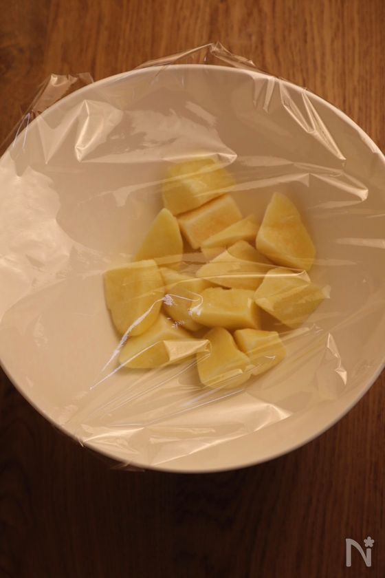 (1) 耐熱容器にポテトを入れ、ラップをして電子レンジ600Wで5分加熱する。
