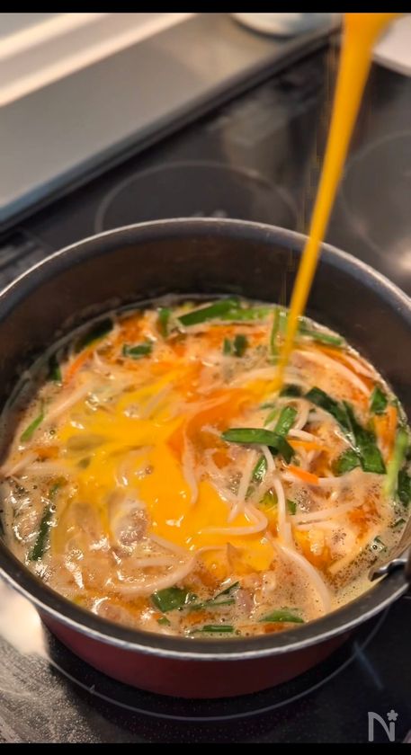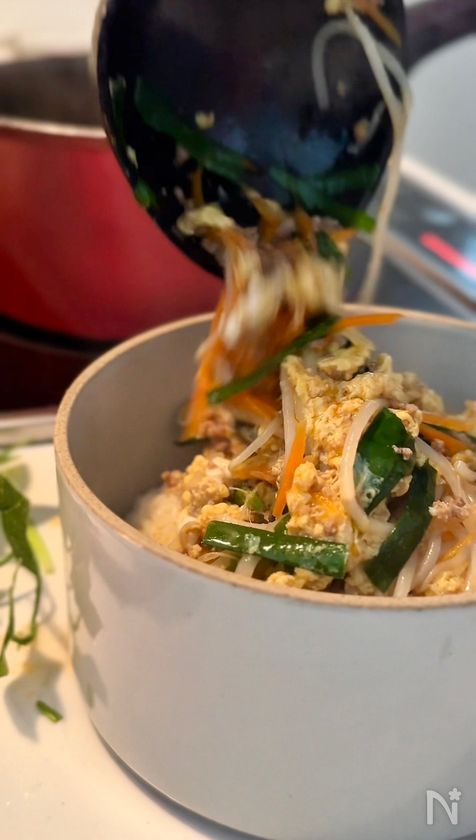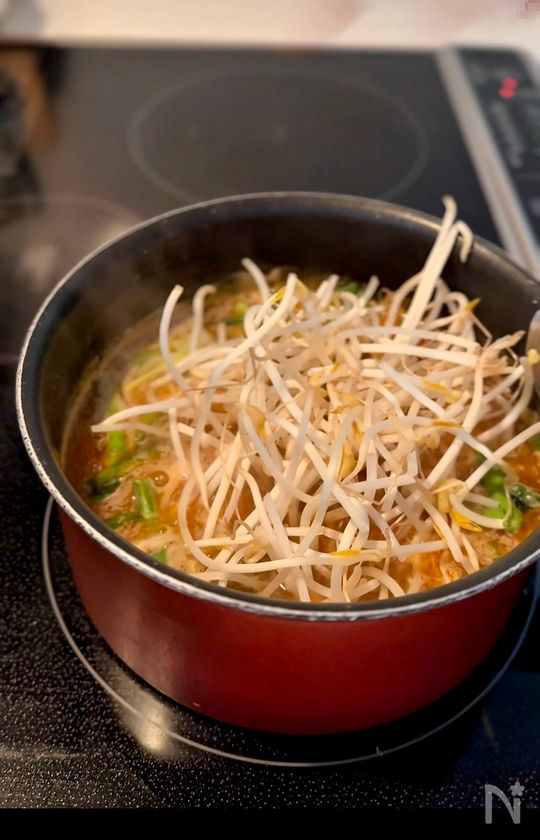 (3) ②の鍋にスライサーで、にんじんを細切りに、ニラは、食べやすい長さに切り、もやしと一緒に鍋に入れる。