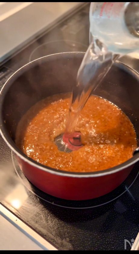 (2) 火が通ったら、水を入れ、煮立たせる。