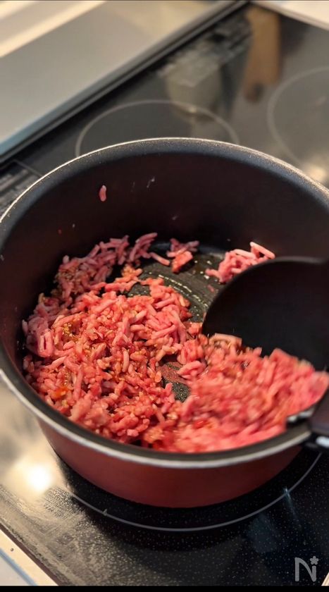 (1) 鍋に、合い挽き肉、【A】を入れ混ぜて下味をつける。火をつけ中火で炒めていく。