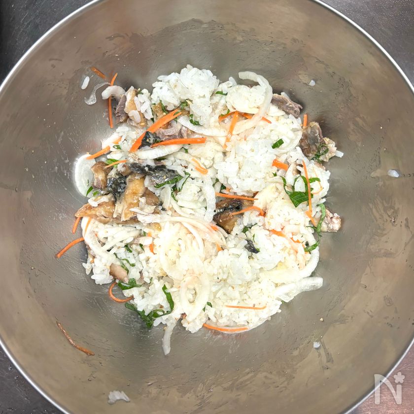 (7) ボウルにご飯を入れて塩ひとつまみ(分量外)をふり、⑥の漬け汁大さじ2程度を回しかけ、さっくりと混ぜる。