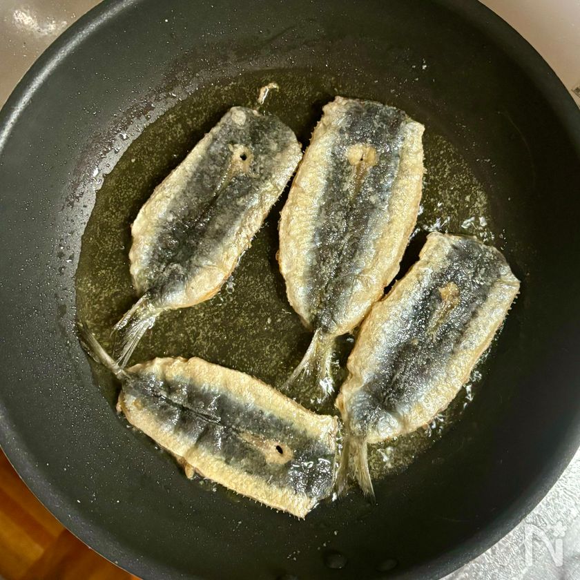 フライパンにサラダ油を熱し、いわしを皮目を下にして並べ入れ、弱めの中火で片面2分45秒ほどずつ両面をこんがりと焼いて火を通す。