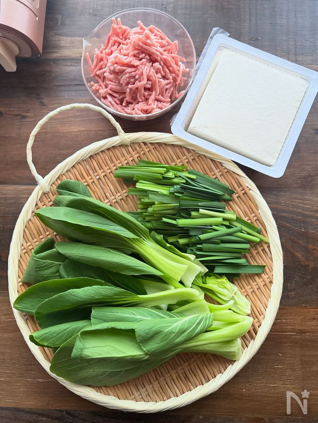 (1) チンゲン菜はひと口大に切る。にらは4〜5cm長さに切る。絹ごし豆腐は水けを切る。