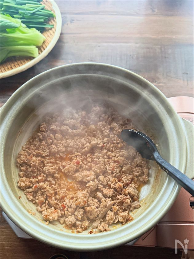 (2) 鍋にごま油を入れて中火で熱し、豚ひき肉を加えて炒める。肉の色が変わってきたら【A】を加えて味付けをする。