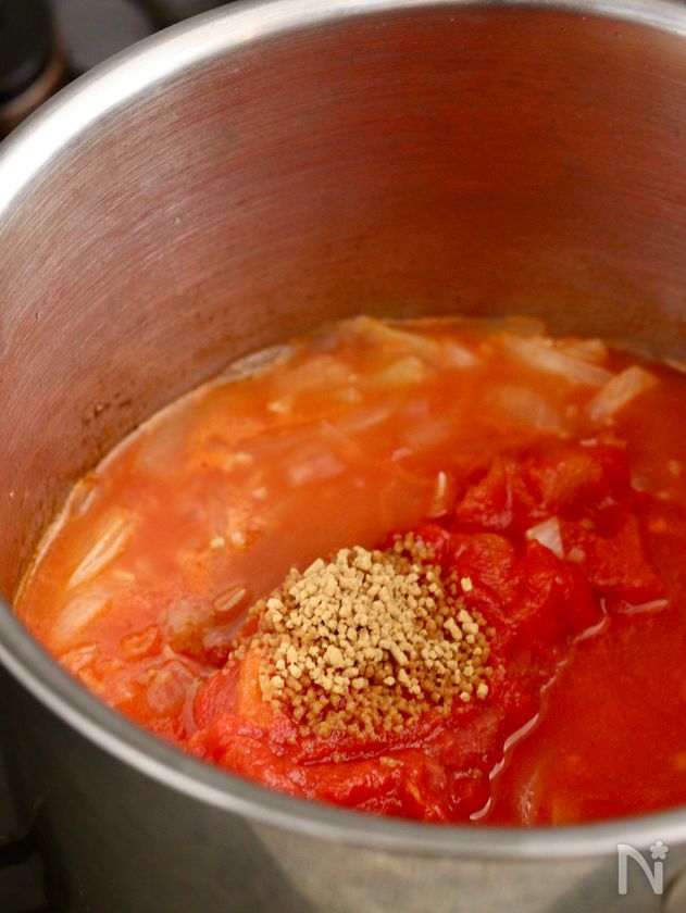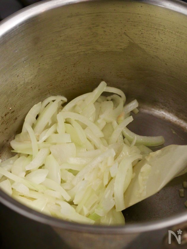 (3) 玉ねぎが透き通ってきたら【A】を加え、ふたをして弱めの中火で約5分煮る。