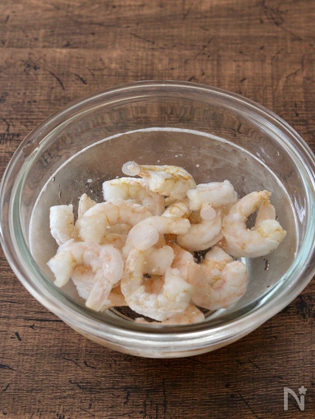(下準備) ・むきえび(冷凍)は塩水(約3%)で解凍する。