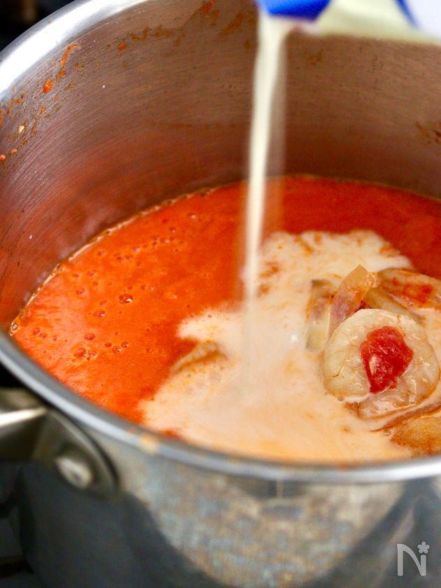 (6) 取り出したえびと有機豆乳無調整を加え沸騰させないように温める。お好みで乾燥パセリ、粗びき黒こしょうをふる。