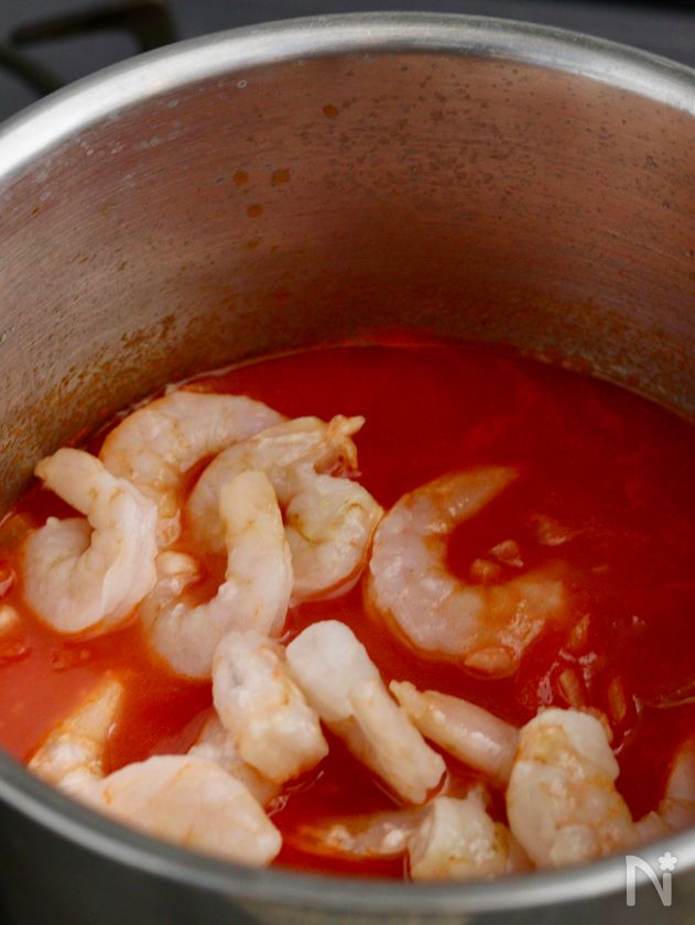 (4) さらに水けを切ったむきえびを加えて約3分煮る。火を止め粗熱を取る。