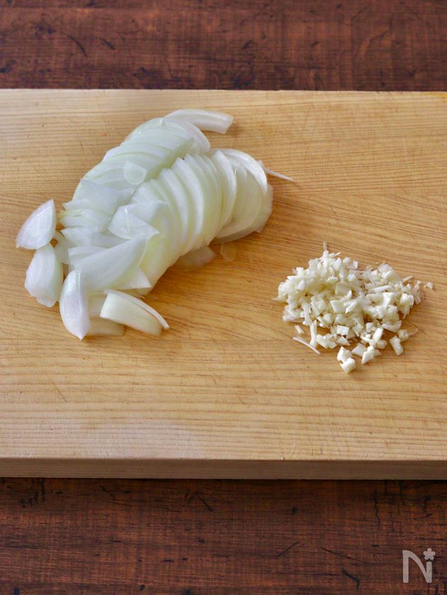 (1) 玉ねぎは5mm幅の薄切りにし、さらに半分に切る。にんにくはみじん切りにする。