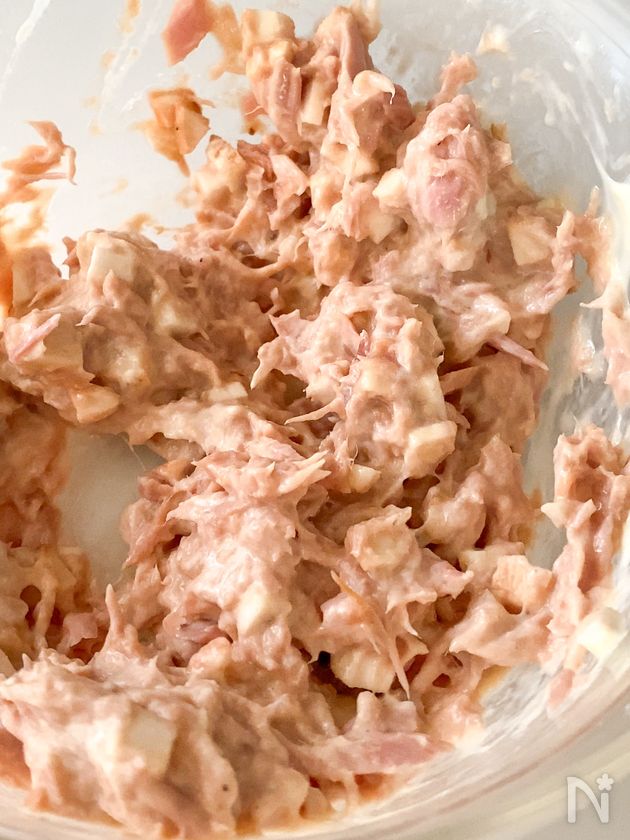 (2) 汁気を切ったツナ缶、1でみじん切りにした軸、【A】を混ぜ合わせる。