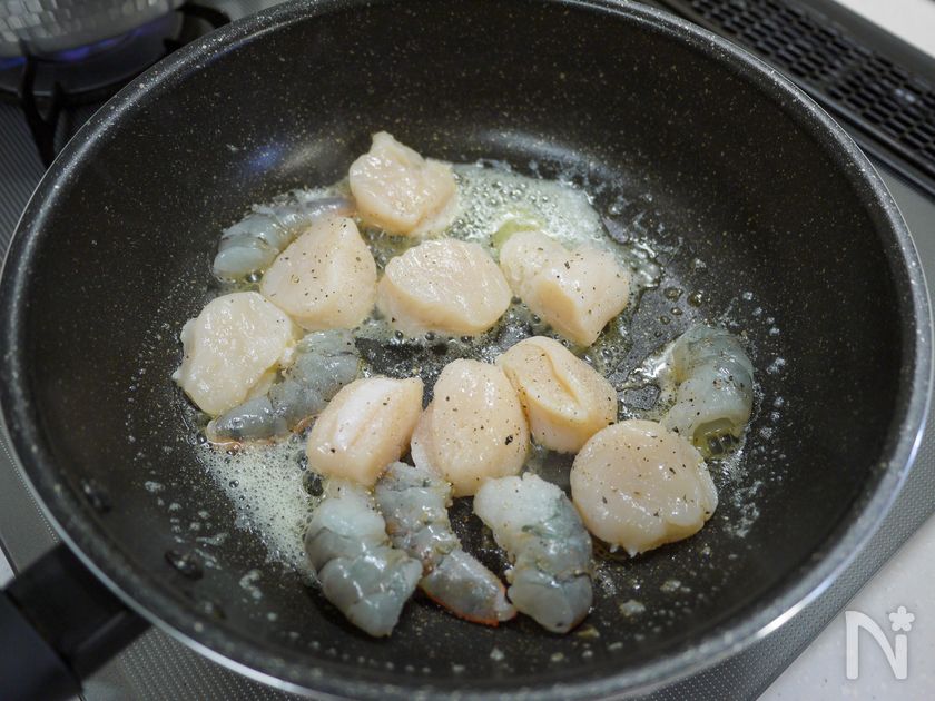 (1) 熱したフライパンにバター(15g)を溶かしてホタテと