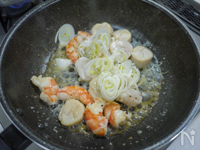 (2) 海老の色が変わるまでしっかりと炒めたら塩、胡椒をし