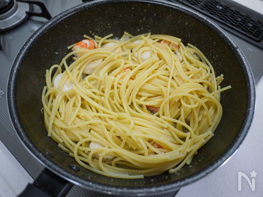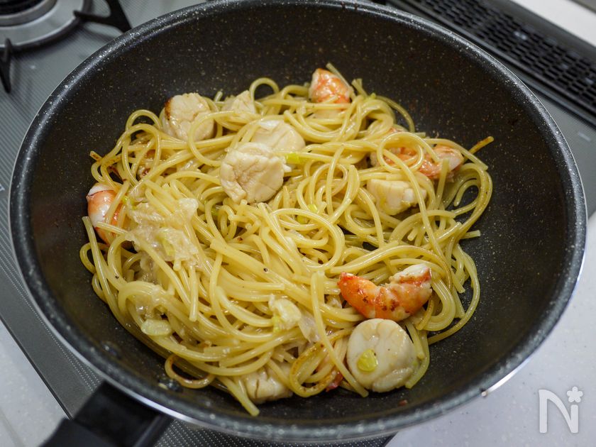 箸で食べる「ホタテと海老の和風スパゲッティ」