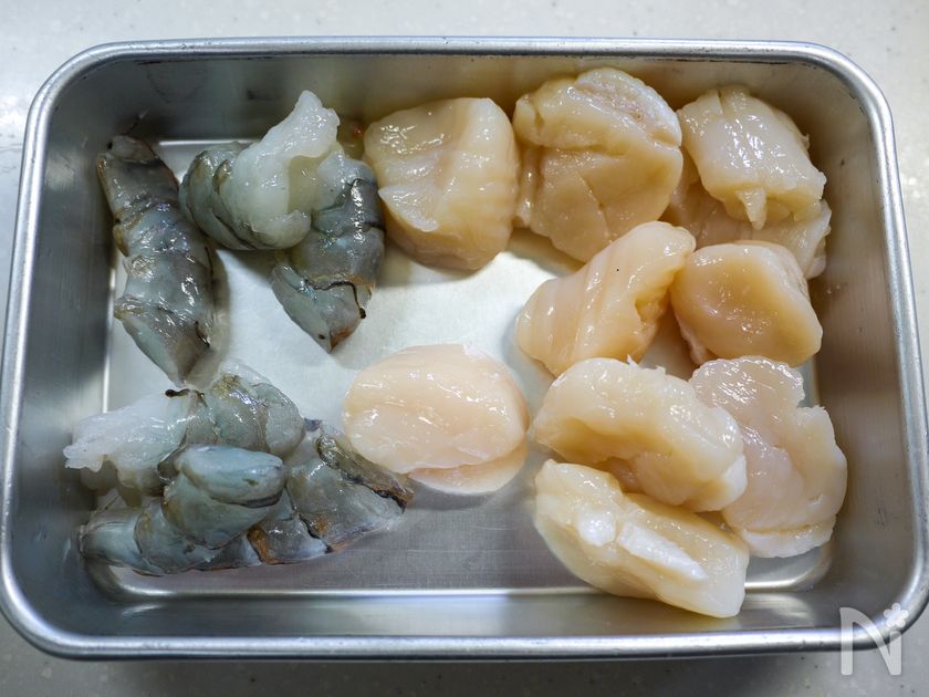 (下準備) ホタテは大きくなければそのままで海老は尾と殻と背わたを