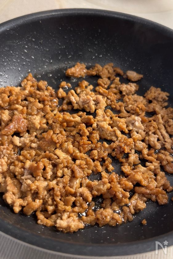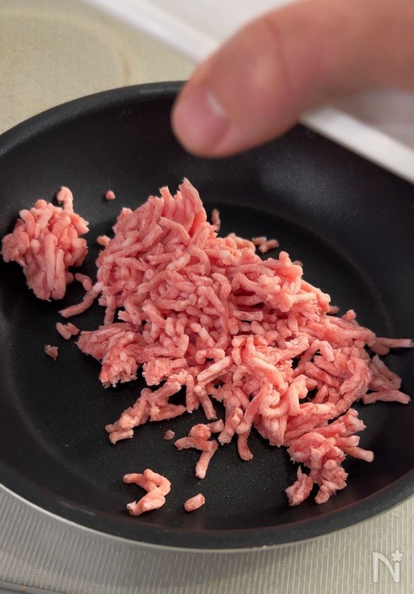 (1) フライパンに豚ひき肉を入れて、中火にかける。