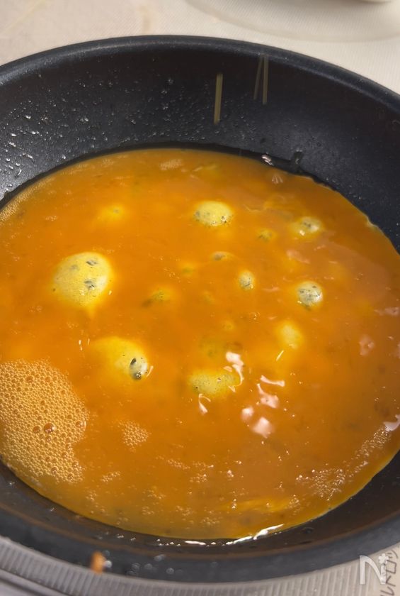(3) 同じフライパンに油をひき、中火にかけ、卵液を入れる。