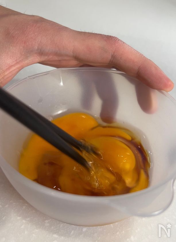(下準備) 卵はボウルに割り入れて、【B】と混ぜ合わせる。