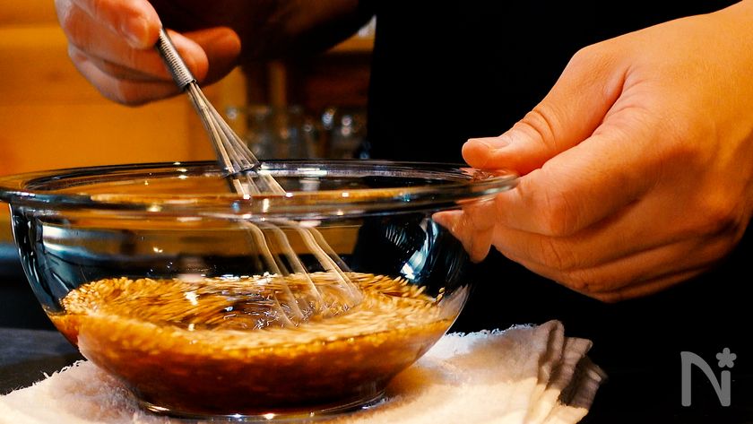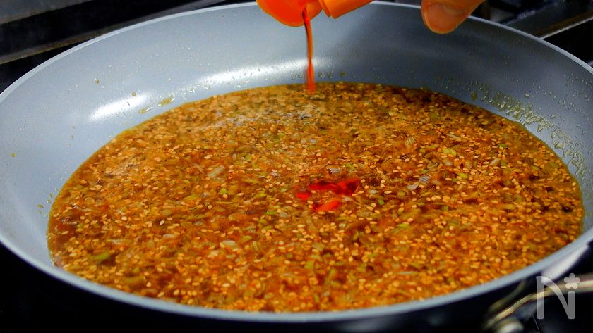 工程6)ラー油の量はお好みで。合わせ調味料をつくるときに赤唐辛子を刻んで加えると、より辛いタレになります。
