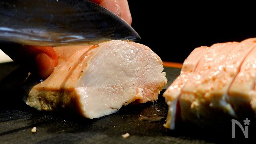 (3) 鍋に湯を沸騰させ、火をとめた状態で鶏肉を入れ蓋をして15分おく。15分後、上下を入れ替えもう一度15分おく。15分後、取り出し適当な大きさに切る。
