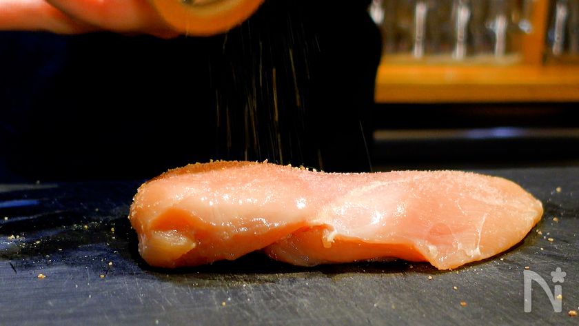 (1) 蒸し鶏をつくる。鶏むね肉は皮や余分な筋を取り除く。両面に塩 2つまみ、こしょう 少々をし、手でかるく押さえる。にんにくは包丁でつぶす。