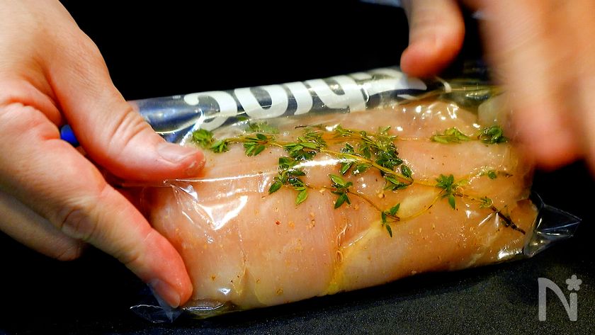 (2) 耐熱袋に鶏肉、にんにくを入れる。タイムを鶏肉をはさむように入れ、オリーブ油を加える。しっかりと空気を抜いて密閉し、オリーブ油をなじませる。