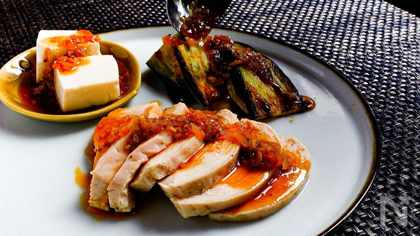 (7) 皿に蒸し鶏、焼いたナス、豆腐(分量外)などを盛り、よだれダレをかける。