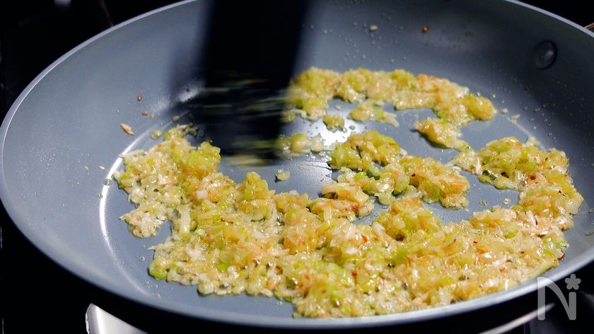 (5) フライパンにごま油をひき中火にかける。温まったら長ねぎを加え油がなじむように炒め、塩 1つまみをし、焼き目がつくまで炒める。