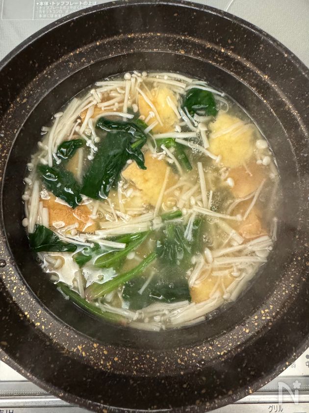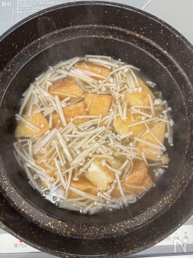 (1) 鍋に、厚揚げ、えのき茸、水、【A】を入れ、温める。