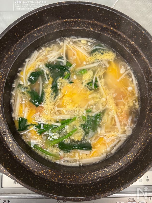 (3) 卵を溶いて回し入れ、火が通るまで煮込む。