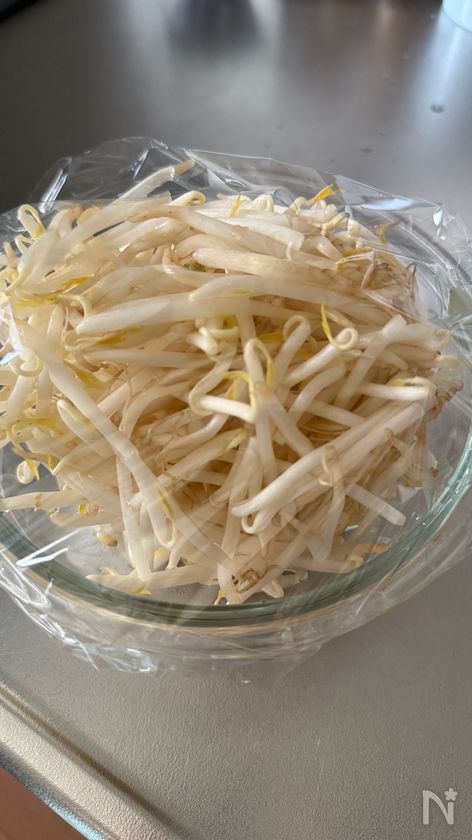 (1) もやしはさっと洗って耐熱ボウルに入れる。