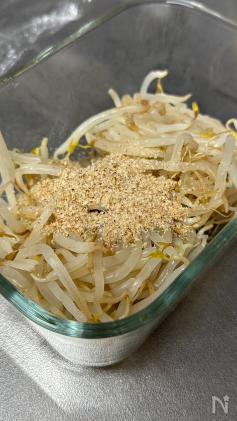 (2) 別の容器に【A】をあわせ、汁気をしぼったもやしとすりごまを加えて和える。