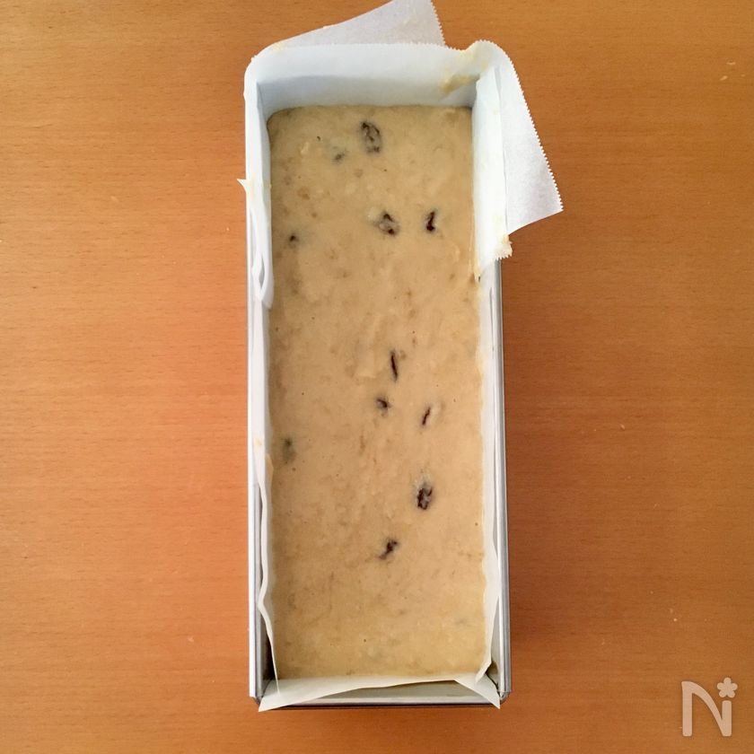 (4) レーズンを加えてかるく混ぜ合わせたら型に流し込む。