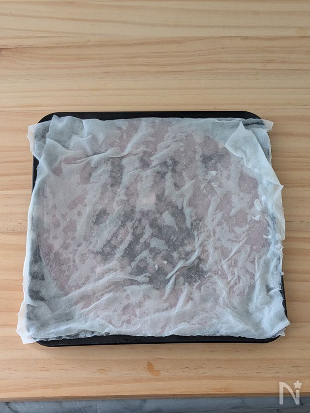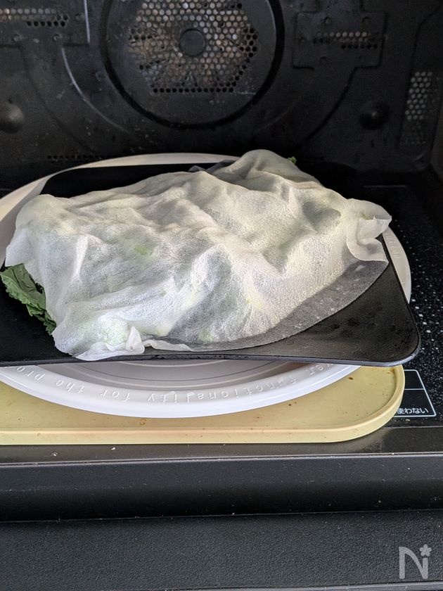 水を含ませたリードクッキングペーパーをかぶせ、電子レンジ(600W)で2分半〜3分加熱し、そのまま置いてあら熱を取る。