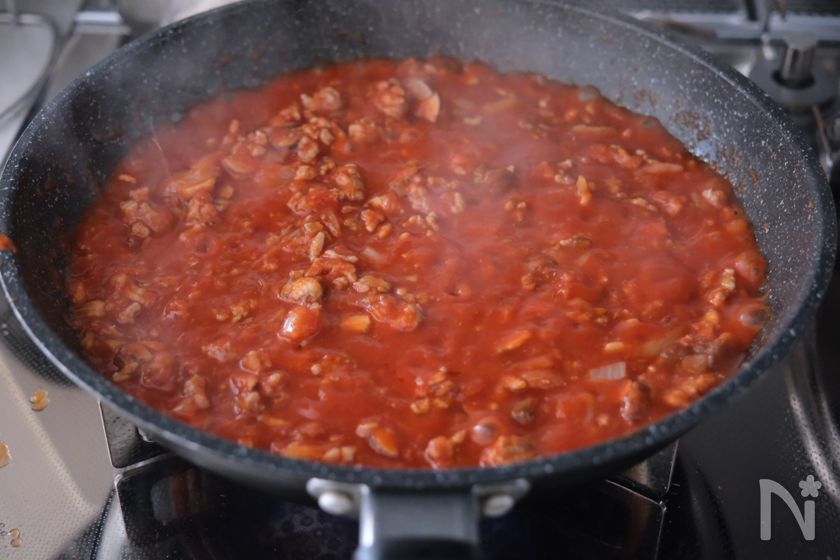 工程3でミートソースを加熱するときは、時々混ぜながら焦げないように気をつけてください!
