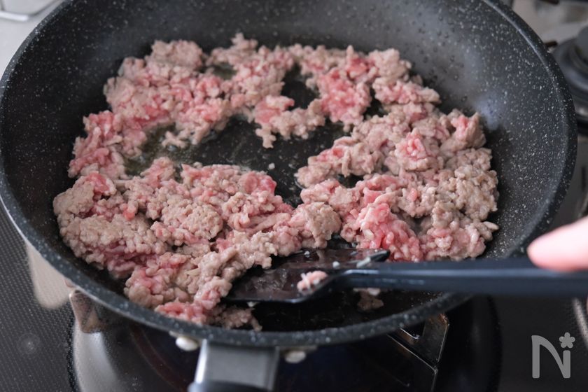 (1) フライパンにオリーブオイルとみじん切りにしたにんにくを入れて中火で加熱し、香りが立ったら豚ひき肉を加えて色が変わるまで炒める。