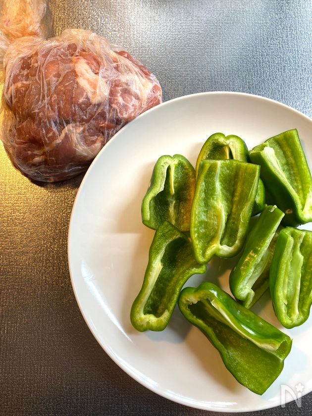 (1) ピーマンはヘタと種を取り、縦半分に切る。豚こま切れ肉と【A】をポリ袋に入れ、袋の上から揉み込む。
